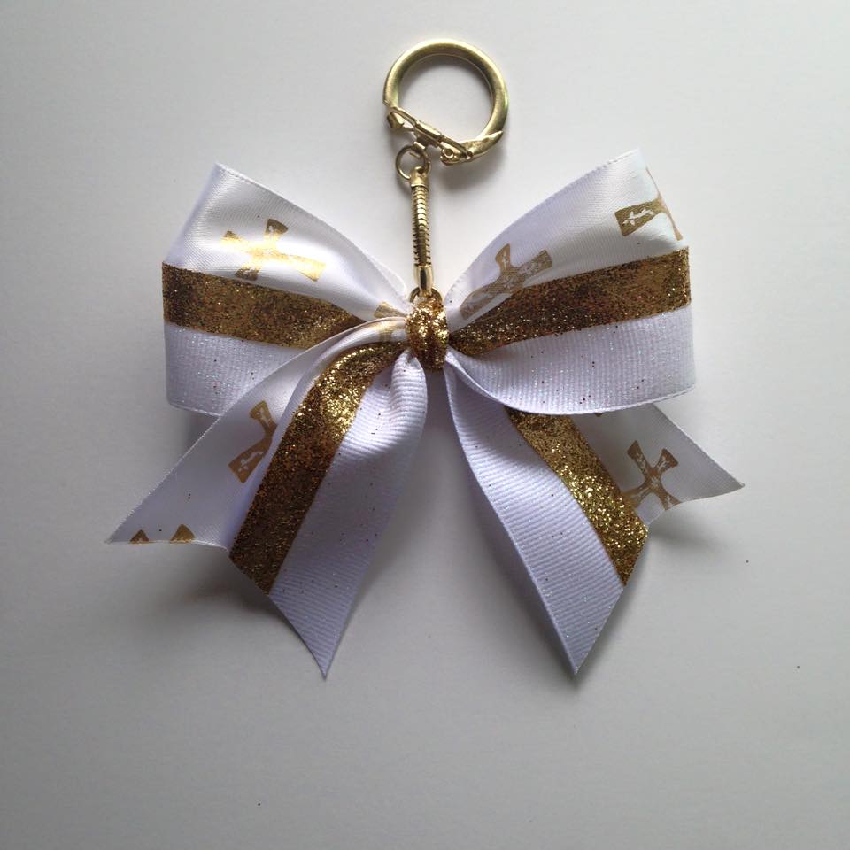 Tiny Double Bow -Glitter Gold and White with Crosses-keychain
